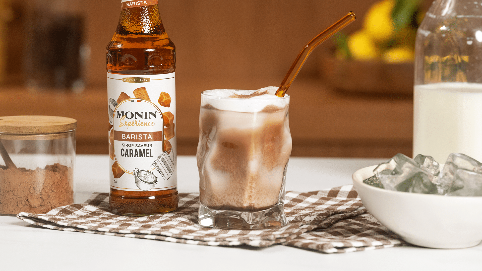 2 cl de sirop saveur Caramel Monin Expérience, 12 cl de lait écrémé, 2 cuillères à café de cacao en poudre, glaçons